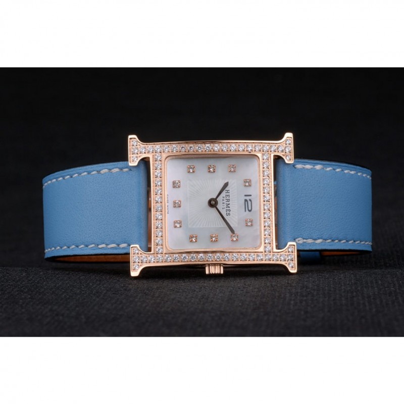 Orologio Replica Hermes Heure H Oro Rosa con Lunetta in Diamanti e Cinturino in Pelle Blu